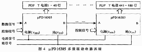 在驱动PDP时,在维持期和寻址期的初始化阶段,利用的是μPD16305的全高或全低工作状态(可参见表3);而在寻址期的扫描阶段,利用的是μPD16305的移位工作状态,以实现逐行扫描。