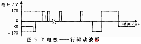 在维持期里,所有Y电极的波形完全一致。但在寻址期中扫描寻址时,各行的Y电极有效时间不同,出现有多种电压。所以在维持期和寻址期,可以通过MOS开关管的不同状态,使驱动芯片的电源脚和地脚在不同时刻与不同电压相接,以得到所需要的波形。这种连接方式降低了输出级MOS管上的电压,应用起来有很大余地。