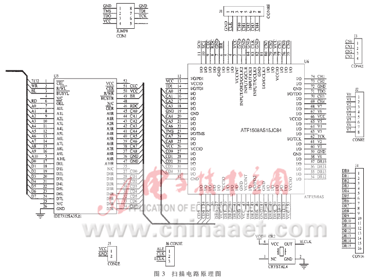独立扫描模块的功能是以双口RAM 为中介将单片机送来的资料在LED 点阵显示屏上显示出来,其电路原理图如图3所示。单片机总线将处理好的待显示数据存放在U5(双口RAM IDT7132SA35JS中,然后U6(CPLD芯片ATF1508AS15JC84,用Verilog HDL语言编写其总线读逻辑)读取存放在U5中的待显示数据并驱动显示屏。整个显示屏为128×32点阵,一次扫描一个字节即8位,为此全屏显示需要128×32÷8=512字节。将地址线A9R、A10R 接地,这样只允许访问U5中的低512K 字节。 CA0~CA8是CPLD 输出到U5中的地址总线,CD0~CD7是从U5读出数据的数据总线。 J1是行扫描信号接口,CH0~CH4 为行扫描计数器输出信号,时钟信号可从CLK 输出给行扫描计数器。 J2为列扫描控制信号V0~V7输出接口。 DR0~DR15为一色的列选通控制信号输出,由于I/O端口引脚不够,所以另一色的列选通信号采用译码电路译码输出,用J3的四线输出。 CON1为JTAG 接口,J6为时钟源选择接口,可接单片机的ALE信号,也可接有源晶振CR2的输出。有源晶振CR2相当于一信号产生电路,只要其2脚接地,4脚接电源,3脚就有额定的输出波形。