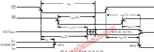 主控电路的功能是读取双口RAM中的数据并通过译码逻辑电路将数据显示在LED点阵显示屏的特定位置上。因为只用到单片机的一部分功能,所以使用CPLD芯片将MCU中的总线读控制器及其外围译码逻辑电路集成在一起。如若采用传统方案,就必须采用多片芯片;而使用CPLD后,只用一片芯片就可以实现所要的功能。总线读控制器是产生时序的电路,需根据内存的读时序进行设计,只有保证正确的时序才能读出数据。双口RAM的读写时序和普通RAM的读写时序基本相同,如图5所示。 CE(芯片使能)是片选信号,在片选信号从高变低之前必须输出地址信号给双口RAM,然后再用读信号去控制OE(输出使能)端,在OE信号由高变低后,数据总线上的数据有效,即可控制读出数据并译码输出。