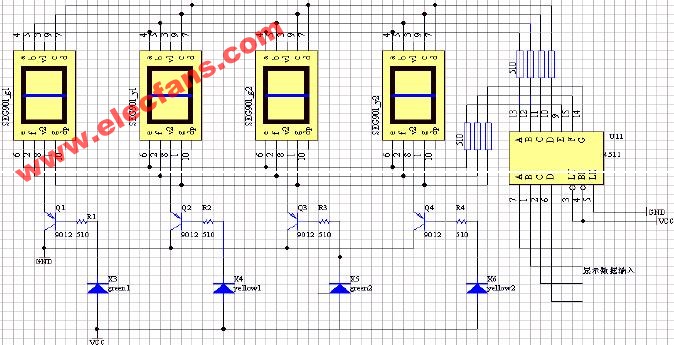 当电路开始工作时,首先东西方向绿灯对应的数码显示器显示值为9,与此同时南北方向的红灯对应的数码管显示器由12逐步递减,当9减到0时,然后跳变为黄灯对应的数码显示器显示值3,而此时南北方向的红灯对应的数码管显示值已由12减到3,正好实现黄灯与红灯的同步功能,当3减到0时跳变为红灯对应的数码显示器显示,其值为12,反复循环。其电路原理图如图2-7所示。