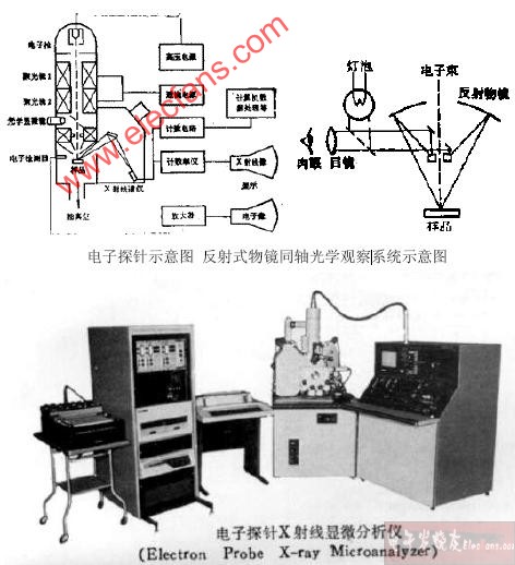 电子探针在镜筒部分与扫描电镜明显不同之处是由光学显微镜。它的作用是选择和确定分析点。其方法是,先利用能发出荧光的材料(如ZrO2)置于电子束轰击下,这是就能观察到电子束轰击点的位置,通过样品移动装置把它调到光学显微镜目镜十字线交叉点上,这样就能保证电子束正好轰击在分析点上,同时也保证了分析点处于X射线分光谱仪的正确位置上。在电子探针上大多使用的光学显微镜是同轴反射式物镜,其优点是光学观察和X射线分析可同时进行。放大倍数为100-500倍。