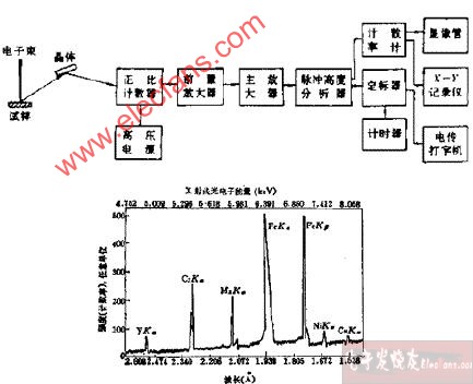 由分光晶体所分散的单一波长X射线被X射线检测器接受,常用的检测器一般是正比计数器。当某一X射线光子进入计数管后,管内气体电离,并在电场作用下产生电脉冲信号。下图示出了电子探针中X射线记录和显示装置方框图。可以看出,从计数器输出的电信号要经过前置放大器和主放大器,放大成0-10V左右的电压脉冲信号,这个信号再送到脉冲高度分析器。