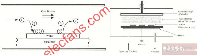 沉积磊晶Thin Film的制程方式。以LED制程为例,将金属有机的化学材料置入Boat内,再将Boat放入加热槽内,每一种金属有机的化学材料皆放入一个加热槽内,再将加热槽内的金属有机化学材料加热,使其产生分解形成气体分子的金属有机化学材料,并通入Ar Gas同时将MOCVD内的电子节流阀开启,让被分解成气体分子的金属有机化学材料接受以Ar作为载子气体的方式将金属有机化学材料送入以在恒温加热的反应炉内,并使之附着于基板表面上,最后再由电子节流阀来控制每一层Thin Film成长的时间,即可形成一层一层的Thin Film Layer※P.S.量子井结构就是利用此设备来成长。(图一)中MOCVD的工作原理如下:当通入金属有机化学材料,如:图一中○1-○7可知为金属有机化学材料离子,由Ar Gas载入到MOCVD反应炉内,因炉管为水平式;因此金属离子在行进的过程中,离子会往下附着于基板上,由○3-○5可以得知,如果金属有机材料反应物种附着于基板的表面上则形成结晶体,而未附着于基板上的反应物种,则被带离开反应炉内,由图中○6-○7即被带离反应炉。