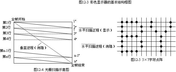 旧式的显示器只有单一的电子枪,仅能产生黑白两种颜色,即是传说中的Monochrome Monitor(单色显示器)。新一代显示器有三只电子枪,每个电子枪都有独立的偏转线圈,分别发出RGB(Red、Blue、Green,红、蓝、绿)三束光线,混合光线可以产生1600万种颜色,或者说真彩色。某些显示器能用一个电子枪发出三束光线,经过混合亦能生成其它颜色。生成彩色图像电子枪要扫描屏幕三次,其过程比黑白图像复杂得多。