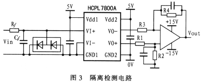 模拟信号检测电路的功能是把强电信号转换为DSP可以读取的弱电数字信号,同时要保证强电和弱电的隔离。笔者选用惠普公司的HCPL7800A型光电耦合器,其非线性度为0.004%,共模电压为l 000V时的共模抑制能力为15kV/lμs,增益温漂为0.000 25V/℃,带宽为100kHz。具体隔离检测电路如图3所示。