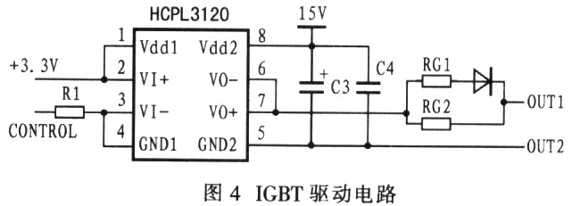 DSP控制电路产生的PWM信号先通过驱动电路,然后控制IGBT开关管的开通状态。笔者选用惠普公司的HCPL3120型专用IGBT驱动电路,如图4所示。驱动电路的输入和输出是相互隔离的,驱动电路还有电平转换功能,将DSP的+5V控制电压转换为+15V的IGBT驱动电压,驱动电路电源采用金升阳公司的B0515型隔离电源模块。