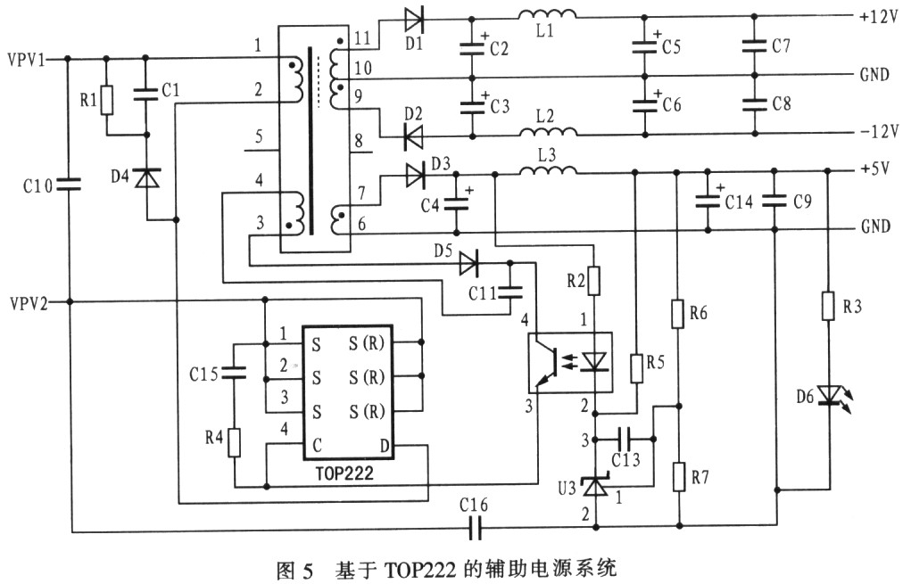 为了给光伏并网逆变器的控制电路、信号采集电路及开关管驱动电路等提供各种工作电源,需要设计1个与主电路隔离的辅助电源。辅助电源的输入电压为100VDC~170VDC;输出的3路电压分别为+15VDC(2.5W)、-15VDC(2.5W)和+5VDC(5W);输出电压波动小于1%。笔者采用最新的Topswitch系列FOP222型电路进行辅助电源的设计[3]。辅助电源主电路采用单端反激式拓扑结构,如图5所示。