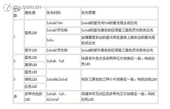 LED照明光源的主流将是高亮度的白光LED。目前,已商品化的白光LED多是二波长,即以蓝光单晶片加上YAG黄色荧光粉混合产生白光。未来较被看好的是三波长白光LED,即以无机紫外光晶片加红、蓝、绿三颜色荧光粉混合产生白光,它将取代荧光灯、紧凑型节能荧光灯泡及LED背光源等市场。