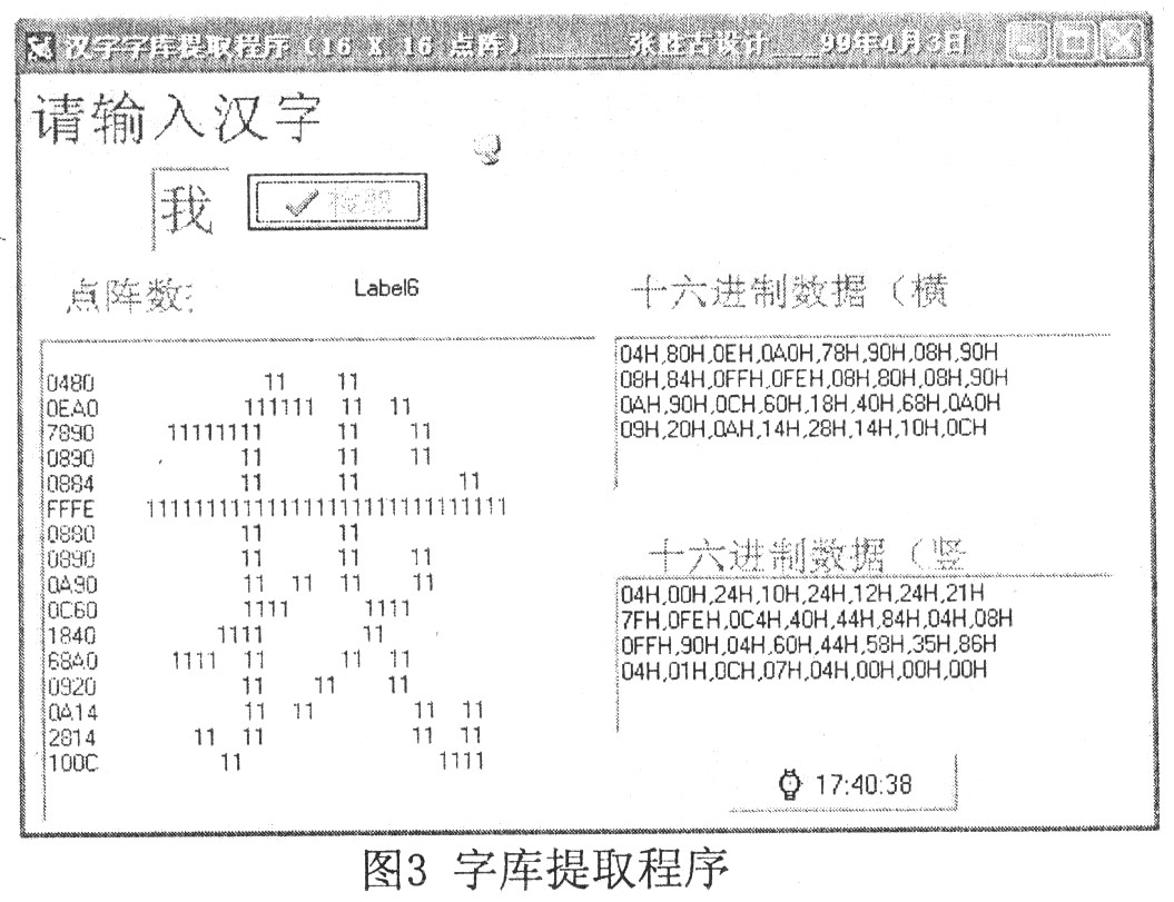 由这个原理可以看出,无论显示何种字体或图像,都可以用这个方法来分析出他的扫描代码从而显示在屏幕上。上述方法虽然能够让我们弄清楚汉字点阵代码的获取过程,但是依靠人工方法获取汉字代码是一件非常繁琐的事情。为此,我们经常采用字库软件查找字符代码,软件打开后输入汉字,点“检取”,十六进制数据的汉字代码即可自动生成,把我们所需要的竖排数据复制到程序中即可,如图3所示。
