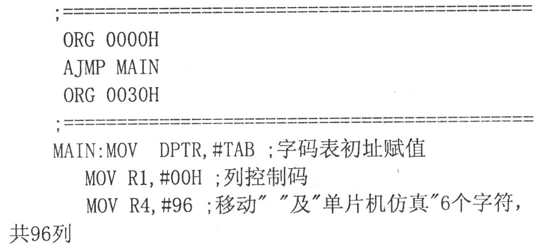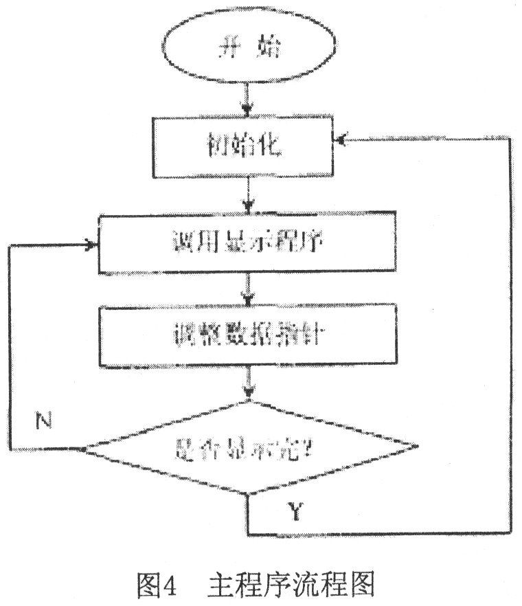 软件程序主要由开始、初始化、主程序、字库组成。其中主程序的流程图如图4所示。下面的程序能够用来实现滚动显示“我爱你一一祖国”。汉字的显示。程序清单如下: