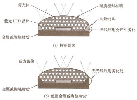 针对白光LED的长寿化问题,目前LED厂商采取的对策是变更密封材料,同时将荧光材料分散在密封材料内,可以更有效地抑制材质劣化与光线穿透率降低的速度。