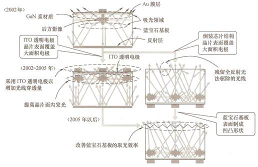有关覆芯片化封装方式,由于发光层贴近封装端极易排放热量,加上发光层的光线发射到外部时无电极遮蔽的困扰,所以美国Lumileds公司与日本丰田合作已经正式采用覆芯片化封装方式,芯片表面加工可以防止光线从芯片内部朝芯片外部发射时在界面处发生反射,若在光线取出部位的蓝宝石基板上设置凹凸状结构,芯片外部的取光率可以提高30%左右。经过改良的大型LED芯片封装实体可以使芯片侧面射出的光线朝封装上方的反射板行进,高效率取出芯片内部光线的封装大小是7mm×7mm左右。大型LED的最后封装方式如图5所示。
