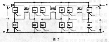 保护电路等组成。其中,一相补偿电路的工作原理图见图2。图中BT1、BT2、BT3是三***立的补偿变压器(一般为3~4台,根据稳压精度及要求的输入电压范围选择),它的次级补偿电压一般设置为7V、14V、28V(或5V、10V、20V)等。S1~S12为12只固态继电器(S1~S4与BT1、S5~S8与BT2、S9~S12与BT3分别组成3个功率桥路)。若因输入电压Ui升高或负载变化而使输出电压Uo高于设定值时,主控板经采样、比较、判断,使补偿变压器工作,产生反极性补偿电压,将输出电压降低到设定值之内。如,为了产生7V补偿电压,交替地触发导通S1/S4、S2/S3,使BT1投入工作。当输出电压Uo低于设定值时,经采样、比较、判断,主控板