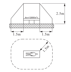 在医院的 2 类医疗场所内离手术台周边水平距离 1. 5 m,高度为 2. 5 m 内的区域被称为“患者区域”,如图1所示。根据 IT 系统设置要求及“患者区域”的示意图可知,手术室内的吊塔、治疗用电插座箱 、无影灯应纳入IT系 统供电。手术室照明、情报面板等与“微电击”无关,可不纳入IT 系统供电,但为保证其供电连续性,建议纳入UPS 供电。
