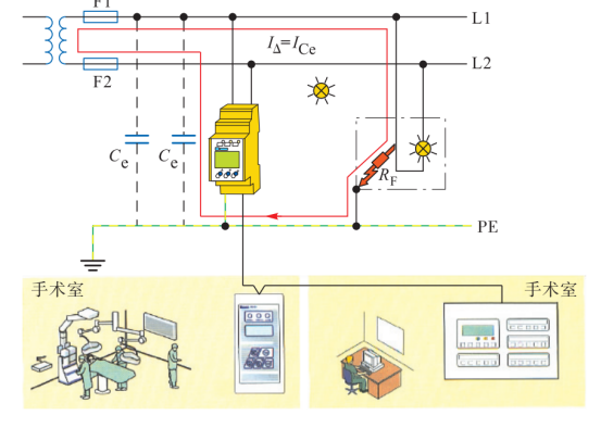 采用医用 IT 系统,电气设备的正常泄漏电流值小于 10 μA,发生第①个接地故障时,故障电流值小于 50 μA,不会对手术患者产生“微电击”;同时,发生第①个接地故障时,绝缘监测装置仅发出报警并不切断电源,可充分保证生命支持系统的电气设备持续供电,从而保证手术室的用电安全。
