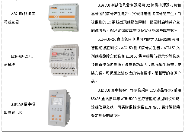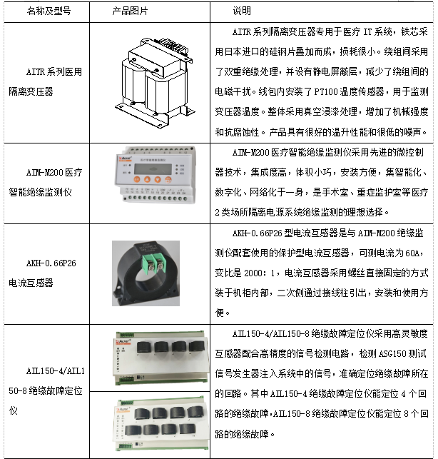 医用IT系统绝缘监测及故障定位产品(七件套)包括AITR系列医用隔离变压器、AIM-M200医疗智能绝缘监测仪、AKH-0.66P26电流互感器、AIL150-4/AIL150-8绝缘故障定位仪、ASG150测试信号发生器、HDR-60-24电源模块和AID150集中报警与显示仪等,产品如表1所示。