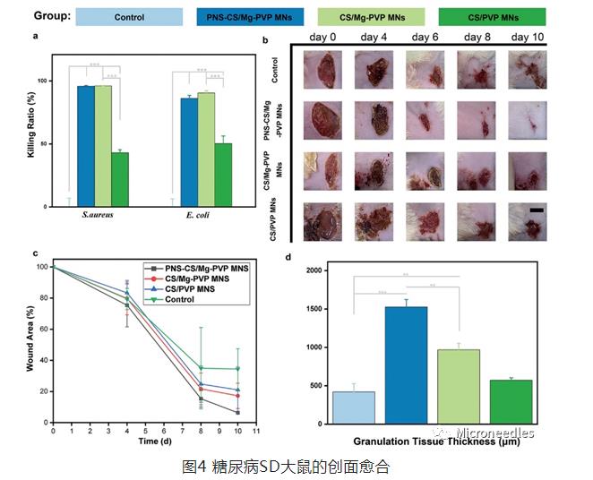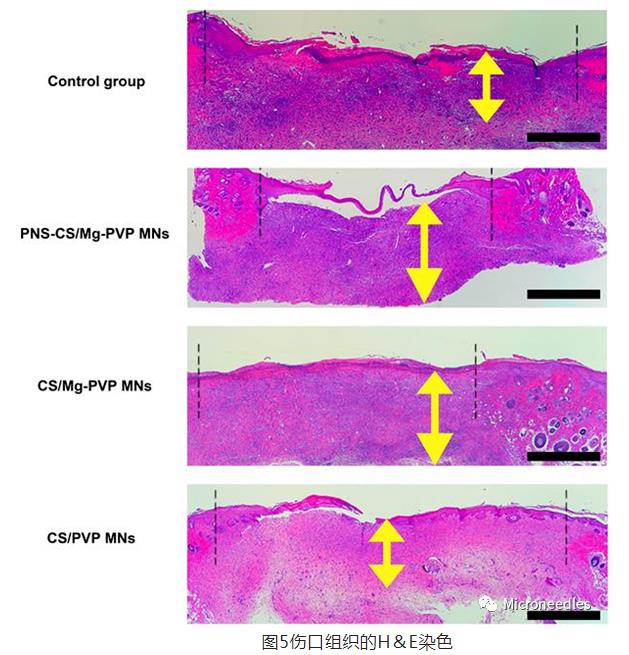 SD大鼠体内研究发现,对金黄色葡萄球菌感染的大鼠进行治疗10天后,PNS-CS/Mg-PVP MNs组的伤口面积(6.34%)远小于对照组(Control)(34.43%)(图4b,c),其肉芽组织厚度(1271.7μm)也远大Control组(437.4μm)、CS/PVP MNs组(606.4μm)和CS/Mg-PVP MNs组(838.3μm)(图4d),并且PNS可促进细胞再上皮化(图5)。MTS结果显示Control组会形成血痂(图6),并且血痂下出现异常柱状上皮堆积及上皮细胞增生,说明因细菌感染导致创面愈合异常及增生性瘢痕。但实验组几乎未见血痂形成,并且PNS-CS/Mg-PVP MNs新生成的成纤维细胞可以促进胶原沉积进而实现细菌感染引起的慢性创伤的愈合。同时,针对血小板-内皮细胞粘附分子(CD31)的相关定量分析显示,PNS-CS/Mg-PVP MNs通过延长PNS的释放可促进血管生成,其新生血管量(8.51%)为Control组(2.27%)的3.75倍。在炎症程度上,PNS-CS/Mg-PVP MNs和CS/Mg-PVP MNs的治疗均下调了创面组织炎症因子IL-6和TNF- a 这归因于它们释放的Mg²⁺抑制炎症因子分泌,降低创面炎症反应。而两组炎症程度非常相似,说明整个给药系统中主要的炎症调节因子是Mg²⁺。并且两组释放的Mg²⁺还可促进巨噬细胞由M1型向M2型转化,这降低了创面的促炎作用,使创面由最初的炎症阶段过渡到组织增殖重塑阶段。
