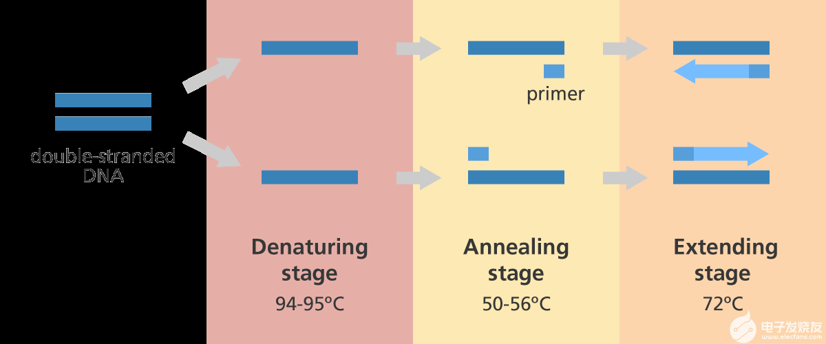 重复此循环过程,很快可产生数十亿个DNA拷贝。在PCR的这三步中,除了加入正确的primer,最为重要的成功因素就是调控准确的温度。