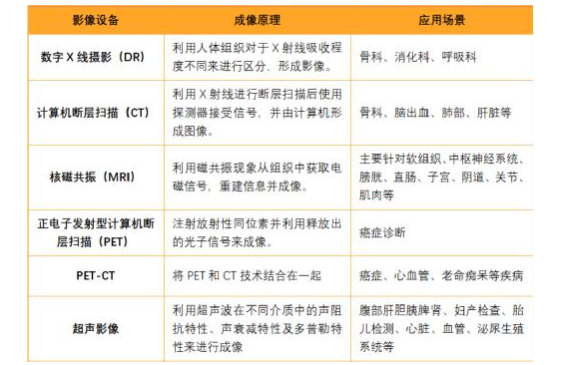 目前医学影像的设备可以分为大型影像诊断设备和其他影像诊断设备,其中大型设备主要有数字X线摄影(DR)、计算机断层扫描(CT)、核磁共振(MRI)和核医学类(PET及复合类PET-CT、PET-MR等),小型的影像诊断设备包括超声和内镜等。根据成像原理的不同,各种设备在临床的上的应用也不相同。各类医学影像设备的特点及应用场景如下表显示。