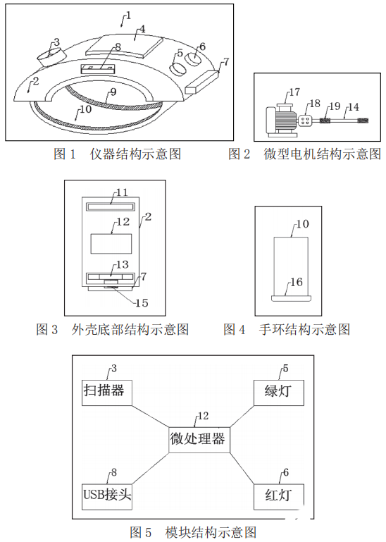 具体请参照图纸,其中图 1 是仪器结构示意图、图 2 是仪器微型电机结构示意图、图 3 是仪器外壳底部结构示意图、图 4 是仪器手环结构示意图、图 5 是仪器模块结构示意图。