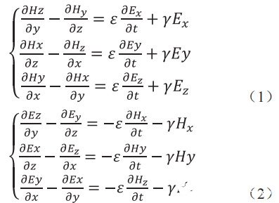 (1)列出时域麦克斯韦旋度方程,用中心差分法替代各场分量对时间、空间的微分,从而得到正交坐标系下的差分迭代式,如式