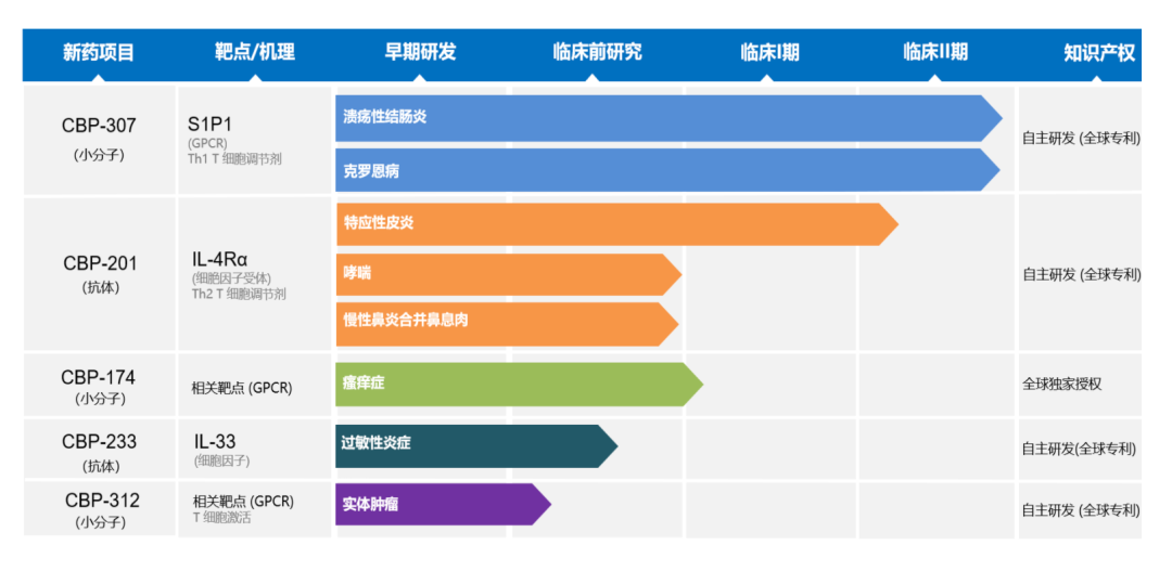 康乃德生物拥有其新药管线中所有产品的全球权利。临床管线中的两个主要项目之一——CBP-307,目前正处在溃疡性结肠炎(UC)和克罗恩病(CD)的II期临床研究中;CBP-201目前正在对中度至重度特应性皮炎患者进行Ib期临床研究。