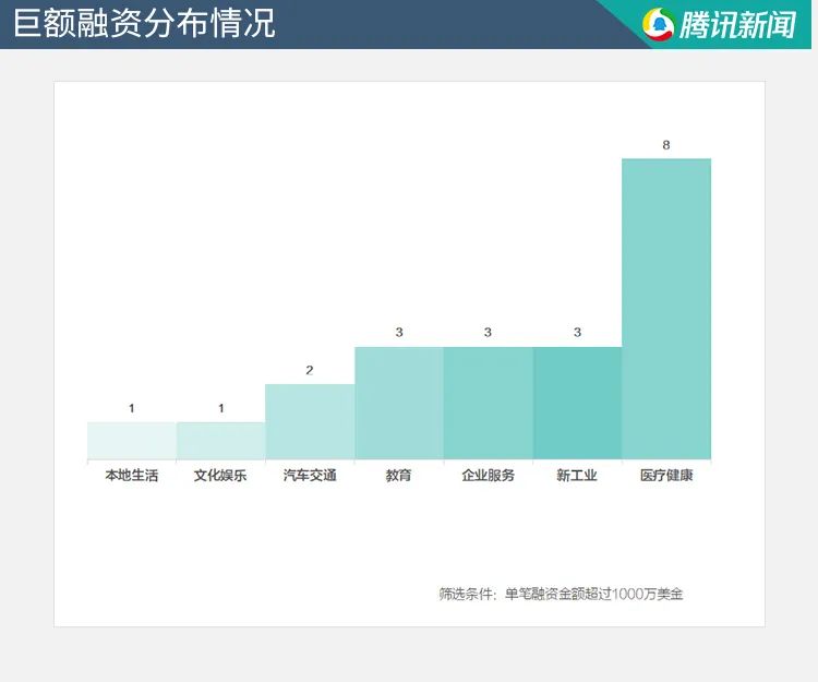 本周单笔融资金额超过1000万美金的融资事件共有21个,主要集中在医疗健康领域。