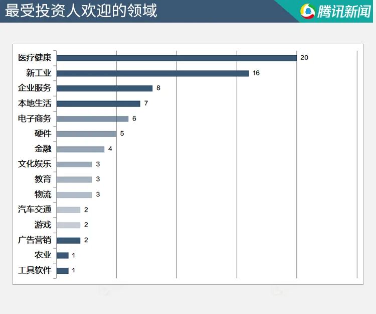 本周最受投资人欢迎的领域为医疗健康领域共有20个项目,其次为新工业领域有16个项目获得投资。