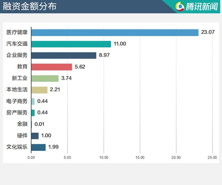 本周共有52个项目获得投资,累计金额超58亿人民币,医疗健康领域成为最吸金的领域,融资金额超过23亿人民币,其次为汽车交通领域共获得了11亿人民币融资。