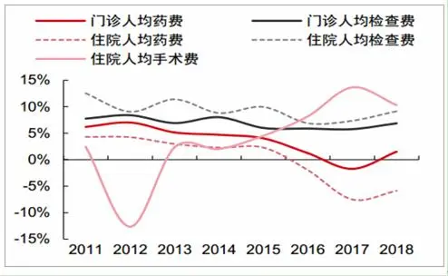 图表:近年来公立医院检查、手术费用增速持续快于药品增速