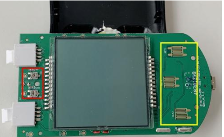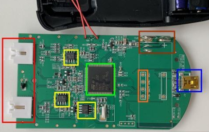 如上图所示,板子正面,一块段式的加宽型 LCD,用于显示尿酸和血糖的测试结果;两个试纸结构插槽(白色);两个电位器(红色),这两个电位器出厂应该校准过参数,如果你拆完还想装回去继续使用,那就别动它俩。屏幕右侧是 3 个功能按键(黄色)。