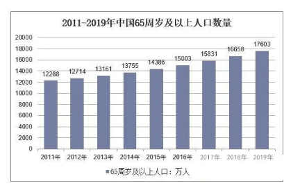 根据国家统计局公布的数据,2019 年我国 60 周岁及以上人口 25388 万人,占总人口的 18.1%,65 周岁及以上人口 17603 万人,占总人口的 12.6%。