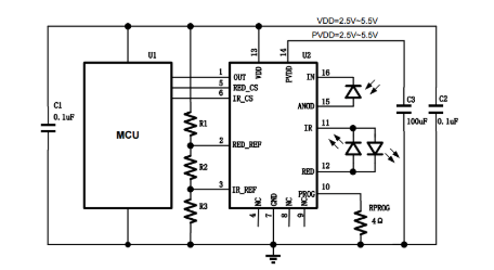 以 TS9514 为例,芯片的 PVDD 和 VDD 为供电引脚,能接受 2.5~5.5V 的电压范围;IN 和 ANOD 之间,接光敏二极管,用于接收透射之后的光信号;IR 和 RED 之间接头尾相连的发光 LED 对管(红光和红外光);RED_CS、IR_CS 为红光使能和红外光使能控制管脚;RED_REF、IR_REF、PROG 用于设置 LED 的驱动电流(详细设置方法请参考 TS9514 的产品手册);OUT 脚为芯片的输出管脚,其信号值与光敏二极管的信号具有线性关系。