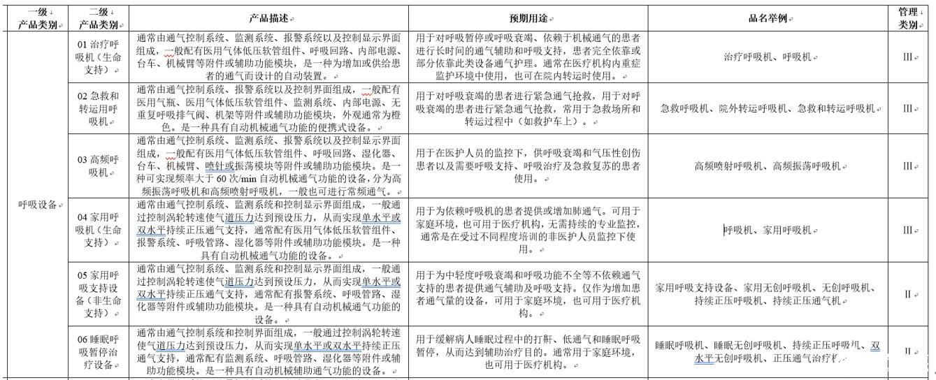 根据国家药品监督管理局发布的2017年版《医疗器械分类目录》,家用呼吸支持设备(非生命支持)、睡眠呼吸暂停治疗设备属于二类医疗器械,一般用于家庭;治疗呼吸机(生命支持)、急救和转运用呼吸机、高频呼吸机、家用呼吸机(生命支持)属于三类医疗器械。