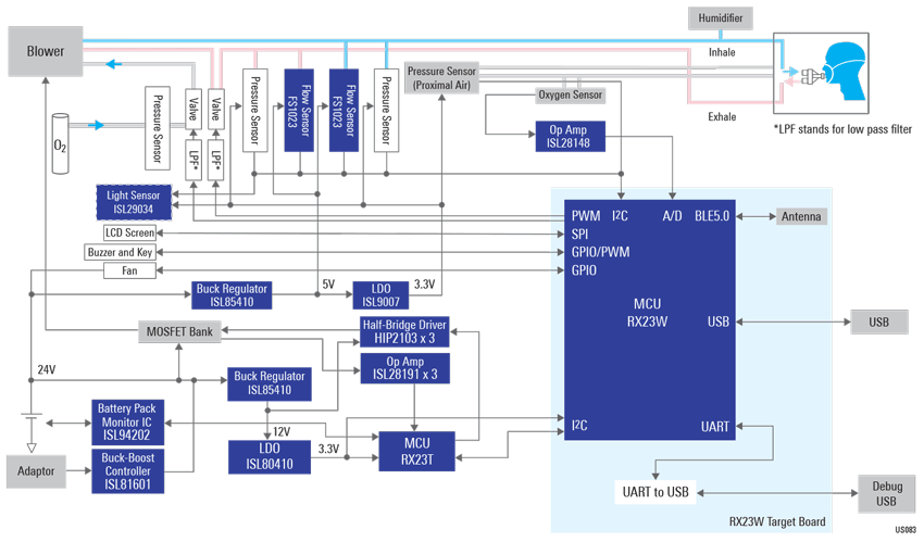 图9:Maxim的CPAP解决方案,蓝色部分Maxim可以提供相应的器件。(图片来源:Maxim官网)