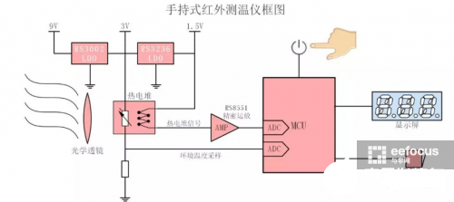 下面是江苏润石提供的基于热电堆传感器的手持式红外测温仪原理框图。