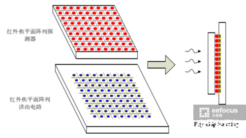 说到红外焦平面阵列热成像仪,我们不得不谈谈焦平面阵列探测器。一般来说,红外焦平面阵列探测器由两部分组成:一是规模为 N×M 大小的红外焦平面阵列,该阵列上排布着一定像元大小的光敏感器件,规模大小也就决定了一个红外探测器的分辨率;还有一个就是与红外焦平面阵列相匹配的读出电路了。这两部分通常由 flip-chip 键合技术通过铟柱或其他材料连接到一起,如下图所示: