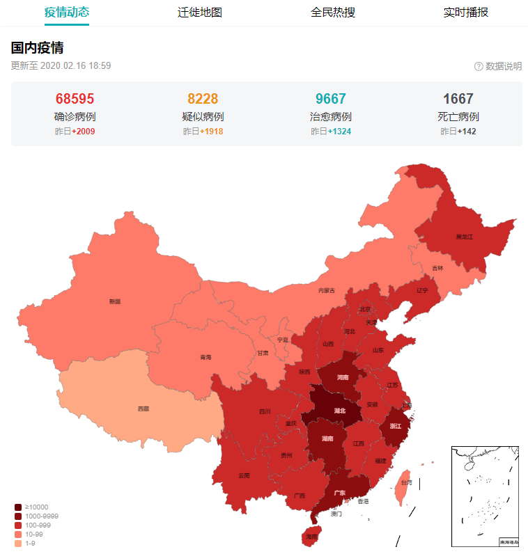 全国防疫工作如火如荼、有条不紊的进展着。从疫情实时大数据报告中可以看到,国内疫情在2020年2月16日确诊病例达68595例,疑似病例达8228例,治愈病例达9667例,死亡病例达1667例。