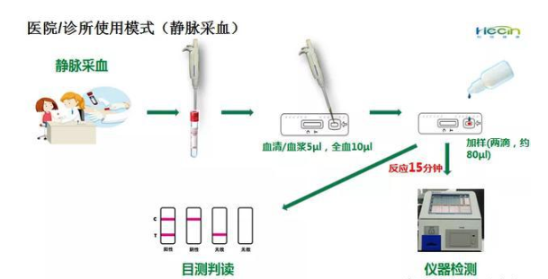 医院对疑似病例进行静脉采血或者末梢采血,采血量约10ul,大概相当于一滴血的质量,之后通过试剂加样,15分钟内通过目测和仪器检测进行判读,就可以明确患者的诊断了。