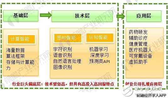 从大的产业链层面来看整个行业的业态,我们可以看到,整个产业链可以分为三个层次:基础层、技术层与应用层。由于基础算法和计算平台、海量的数据来源还有机器学习、图像识别的基础技术的壁垒较高,往往需要较长期的高投入才能有高回报,因此科技巨头往往偏向于布局底层,而创业公司则往往选择在变现能力强、容易进入的辅助诊断、健康管理和药物研发等应用层扎堆。