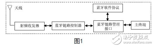蓝牙系统一般由天线单元、链路控制(固件)单元、链路管理(软件)单元和蓝牙软件(协议栈)单元四个功能单元组成,如图1所示。