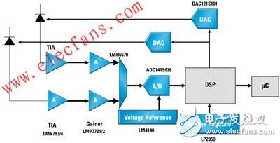 反补偿运算放大器最适合使用在电流-电压转换(跨阻)电路。在医疗仪器中,其中一个最普遍的应用是测量血细胞中的含氧量,称为SPO2或饱和或外围氧气。图1所示为SPO2模块的框图,当中的反补偿放大器(TIA)用来将来自光二极管的电流转化成电压。