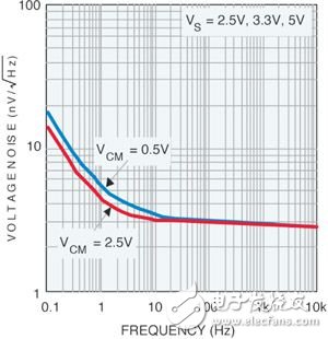 假设您打算利用美国国家半导体的LMP7731来推算峰到峰(0.1到10Hz)电压的噪声量,首先,在指定频带内的频率范围中选择出一个点,例如是1Hz,那对比曲线时的数值便是5.1nV/√Hz (图2),然后用下列的数式来计算噪声的根均方值(RMS):式 1: enrms="enf"√ln(10/0.1), 当中 enf 是在 1Hz 下的噪声通过以上的数式可得出10.9nV的总根均方值噪声,如要计算出峰到峰噪声,只需将这根均方值乘以6.6,这样便可得出72.2nV。这个估算的结果相当不错,它与数据表中列出的规格78nV很接近。