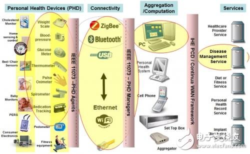 图1是端对端PHD通信示意图,其中展现了许多设备、连接选项、健康服务和数据聚合选项。左面第一列是PHD,它们通过ISO/IEEE 11073系列标准实现了与传输媒介(个域网和局域网)的无缝连接。数据聚合器不仅包括手机和个人电脑,还有个人健康系统等新型设备。这些设备将经过聚合和处理的数据传输给健康服务供应商,而供应商均符合康体佳健康联盟的广域网框架要求。在某些情况下,数据采集最终形成了病人的个人健康记录(PHR)。康体佳健康联盟成立于2006年,其宗旨是开发一个提供个人专属医疗服务的系统。目前,联盟已拥有超过240个会员公司,并与全球的标准组织(IEEE、ISO等)、政府单位和规范机构建立了联系。