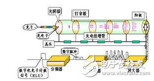 该仪器的光检测部件采用了单光子计数器,其核心部分是一个特殊类型的光电倍增管,它是一个超高真空的圆柱型玻璃容器,其中向光的一面(称为窗口)涂有一层特殊的具有光电效应的稀有金属,称为光阴极;而内部还装有多个以特殊方式排列的电极,称为打拿极或加速极;其后部另有一个电极称为阳极,各个电极之间均加有直流高压[3、4].单光子计数器的结构及其工作原理示意图如图2所示:
