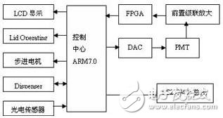 本系统采用MC68322(128K Flash,32K Ram)作为控制中心,以FPGA为计数单元,病人的采样样品经过微孔板,以单光子的形式进入光电倍增管PMT,通过高精度的级联放大器NE5205做前置放大,再经过FPGA做信号的比较(主要去处干扰信号)、分频(得到适当的频率)最后进入单片机做信号处理;单片机把处理的结果可以通过LCD显示,也可以通过RS—232串口与计算机通信实现人机交互;利用4个光电传感器来控制步进电机的状态进而改变微孔板的位置。其硬件结构框图如图3所示: