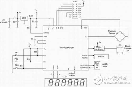 中PWM 输出控制的直流电马达对袖袋进行充/放气。这是该血压计唯一用到 6V 电源驱动马达的地方。如果不能满足电源需求,整个血压计可以用一节 3V 锂离子钮扣电池供电。不过,目前只有少数马达可以靠这种高阻抗钮扣电池驱动,所以,此例可以使用4节普通低成本AAA碱性电池及低压降稳压器 (LDO) 为MCU提供 3.3V电源。假设每天测量两次血压,这些电池可以使用两年。MCU可以长期工作在活动显示计时模式,原因是该模式的电流消耗非常小。另外,用户查看存储的血压读数时也不会增加电流消耗。此外,集成的双通道 DAC能够产生相移180°的正弦波,从而可以提高变送器性能。