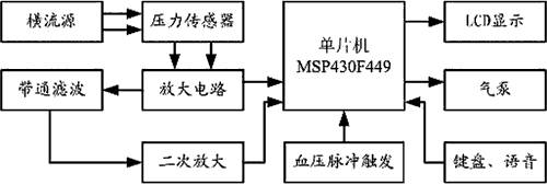 系统框图如图1所示。系统由恒流源、压力传感器、放大电路、带通滤波、二次放大、血压脉冲触发、液晶驱动器、键盘语音电路和单片机组成。