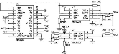 如图4所示,电路由滤波和放大两部分组成。其中MAX267是MAXIM公司出产的一个集成滤波器,可以构成低通、带通、高通、等多种方式,使用灵活,性能远远优于采用集成运放组成的滤波电路。